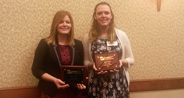 Two Westminster alumni were recently honored with Outstanding Beginning Teacher Awards by the Missouri Association of Colleges of Teacher Education (MACTE). In photo above, Erikka Brown ’14 and Amber (Haslag) Ernst ’13 display the awards they received at the association’s spring 2015 conference.